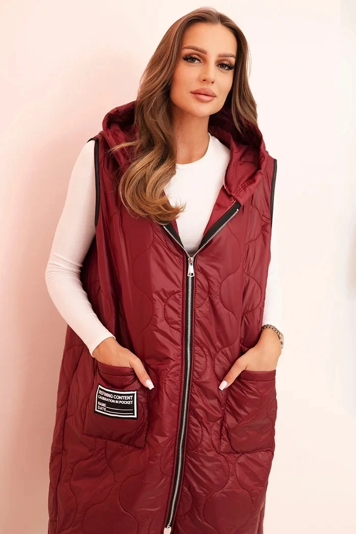 Dámská prošívaná vesta Plus Size s kapucí na zip bordová