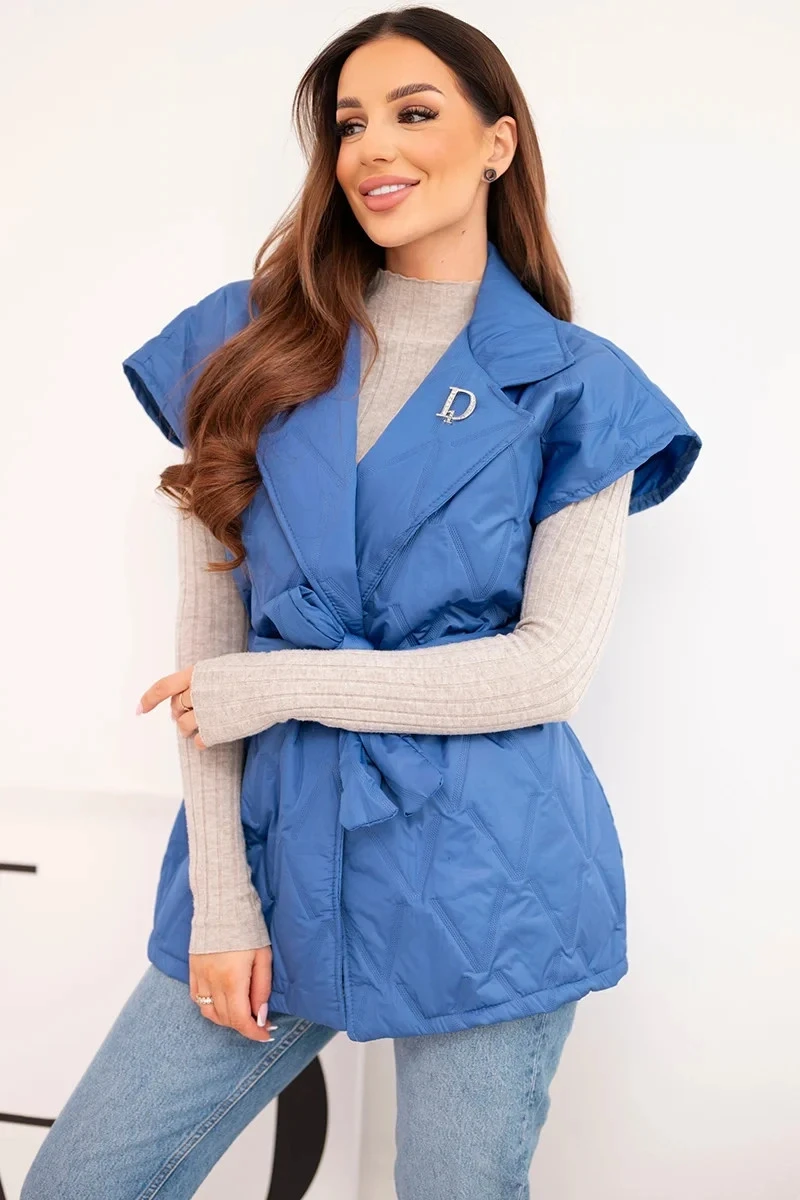 Dámská prošívaná vesta s páskem a širokým límcem chabrová