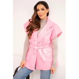 Dámská prošívaná vesta s páskem a širokým límcem světle růžová