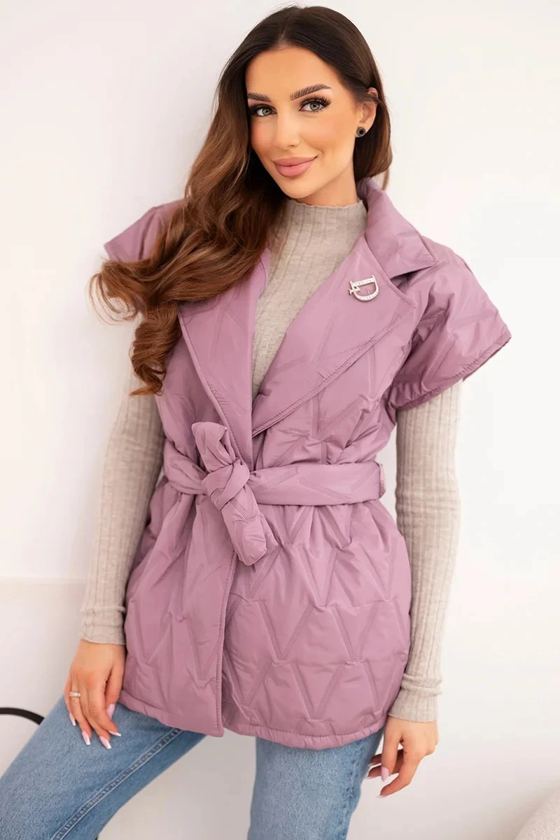 Dámská prošívaná vesta s páskem a širokým límcem tmavě růžová