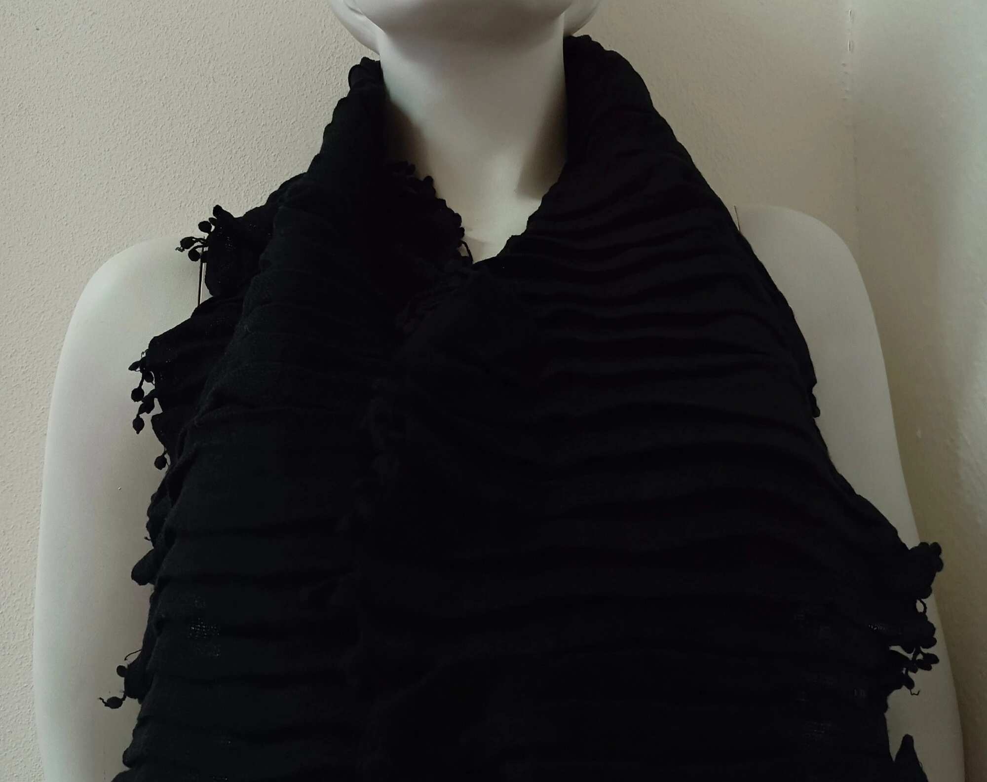 Dámská černá šála řasená a prošitá jemnými gumičkovými vlákny.