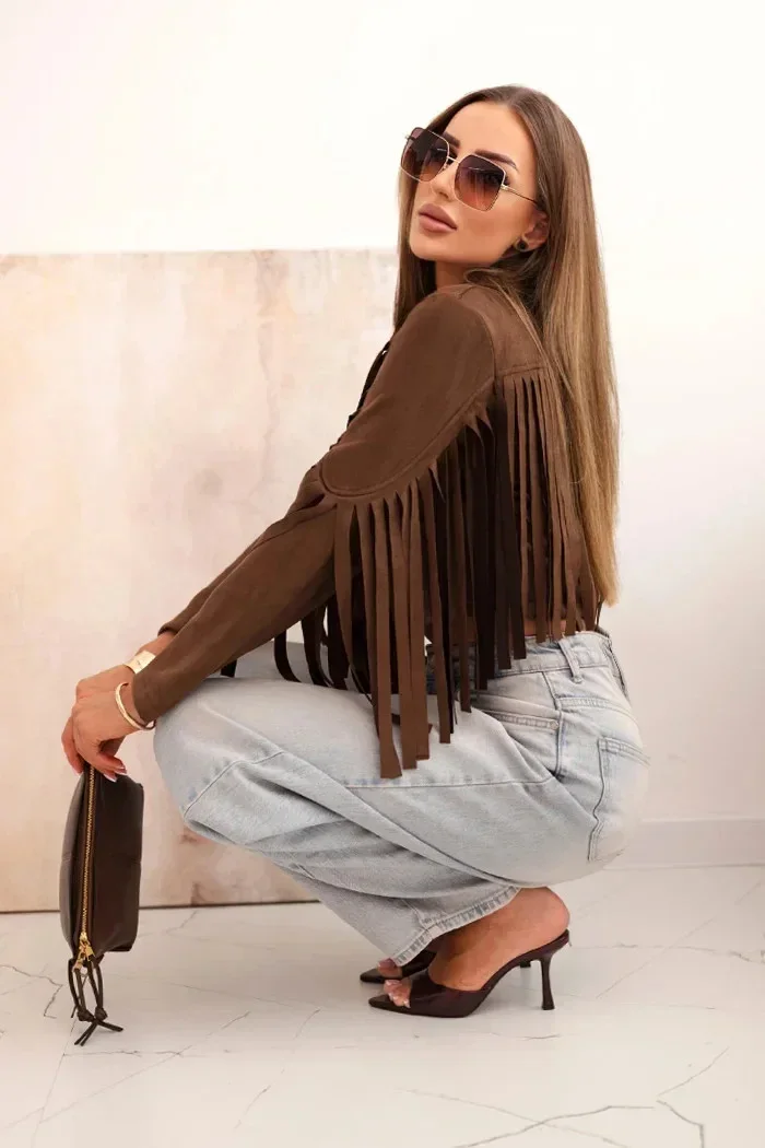 Dámská bunda s třásněmi je výjimečný model, který přitahuje pohledy a dodává outfitu charakter. Vyrobena z měkkého materiálu připomínajícího semiš, dokonale zapadá do nejnovějších boho a western trendů. Krátký střih krásně zdůrazňuje postavu a efektní třásně podél rukávů a přední části jí dodávají uvolněný a stylový vzhled. Skvěle se hodí jak na každodenní nošení, tak na festivaly či venkovní setkání. Tento model je skvělou volbou pro ženy, které si cení jedinečného stylu a pohodlí. Můžete ji nosit jak k džínům, tak k šatům, a vytvářet originální a módní outfity. Velikost je univerzální a bude vhodná pro dámy velikosti S, M nebo L.