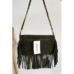 Dámská kabelka Narella z kvalitního semiše v tmavě zelené barvě spojuje elegantní design s moderním doplňkem – třásněmi a řetízkovým popruhem. Kompaktní velikost a precizní zpracování zajišťují pohodlné nošení a nadčasový vzhled, ideální pro denní i večerní příležitosti.