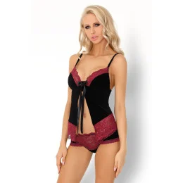 Dámská souprava Beccina LivCo - černá košilka ozdobená růžovou krajkou - mezi poprsím dlouhá černá mašlička - na tenkých ramínkách - rozparek v oblasti břicha - kalhotky z černé látky v kombinaci s růžovou krajkou