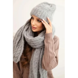 Čepice má klasický střih s módním ohrnutím a zlatou ozdobou vpředu, která dodává celku eleganci. Šála je dlouhá a široká – lze ji volně omotat kolem krku, což zajišťuje dodatečnou ochranu před zimou.