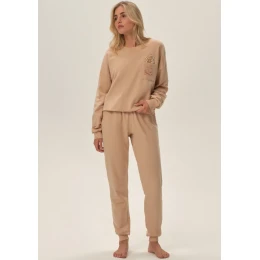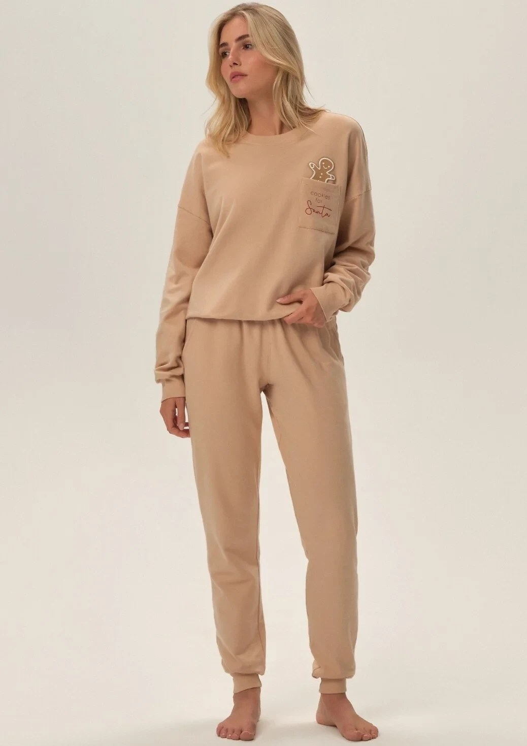 Dámská tepláková souprava od značky Henderson. Souprava je vyrobena z měkké hladké bavlny a zevnitř je zateplená. Mikina má dlouhé rukávy zakončené úplety, kulatý výstřih a je zdobená kapsou s vánočním motivem. Tepláky jsou dlouhé, mají kapsy na bocích a jsou zakončeny úplety.