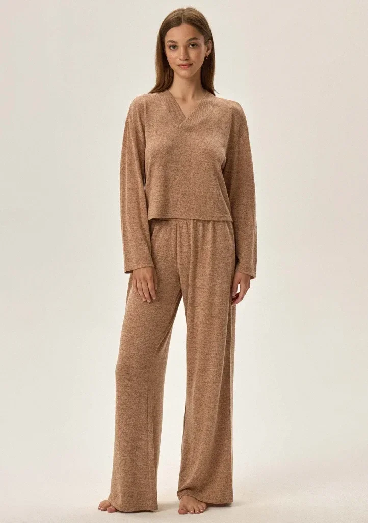 Dámská souprava značky Henderson. Souprava se skládá z volného trička s dlouhým rukávem a výstřihem do "V", který lemuje široký pružný lem. Tričko je volné, kratší délky. Kalhoty jsou dlouhé, v pase jsou do širší obšité gumy. Celá souprava je volného, ležérního střihu.