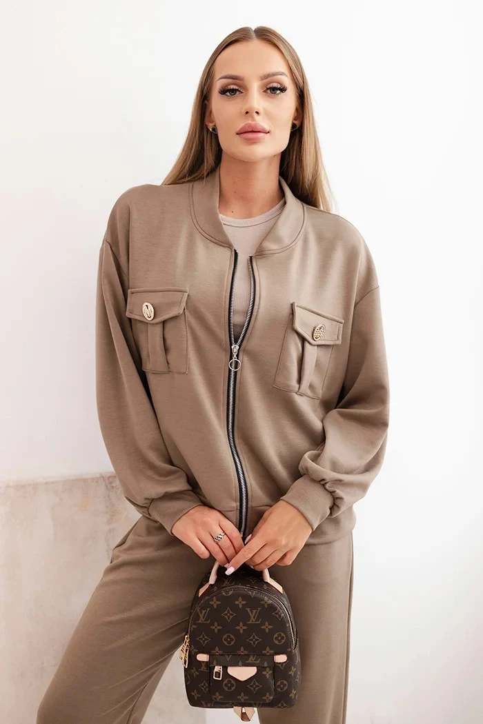 Elegantní a pohodlný dámský komplet v máslovém provedení, vytvořený s ohledem na komfort a módní vzhled. Skládá se z rozepínacího svetru s efektními kapsami zapínanými na ozdobné knoflíky a kalhot s elastickým pasem a šňůrkou, které zajišťují dokonalé přizpůsobení. Vyrobeno z vysoce kvalitní viskózy s přídavkem polyesteru a elastanu, je měkké, příjemné na dotek a skvěle se přizpůsobuje postavě.