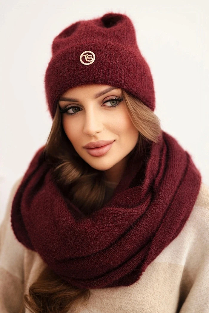 Dámská souprava s čepicí a nákrčníkem z měkké pleteniny bordový