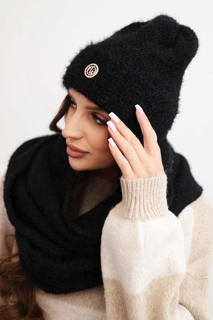 Dámská souprava s čepicí a šálou z měkkého úpletu černý