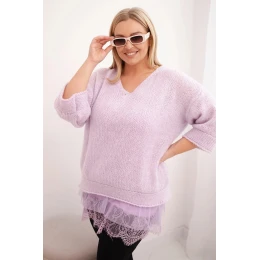 Dámská souprava svetr s výstřihem do V a viskózová blůza s krajkovým lemem světle fialový
