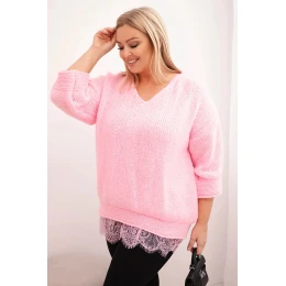 Dámská souprava svetr s výstřihem do V a viskózová halenka s krajkovým spodním lemem cukrová růžová