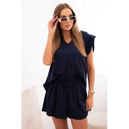 Dámská souprava z viskózy, blůza s volány a krátké šortky modré