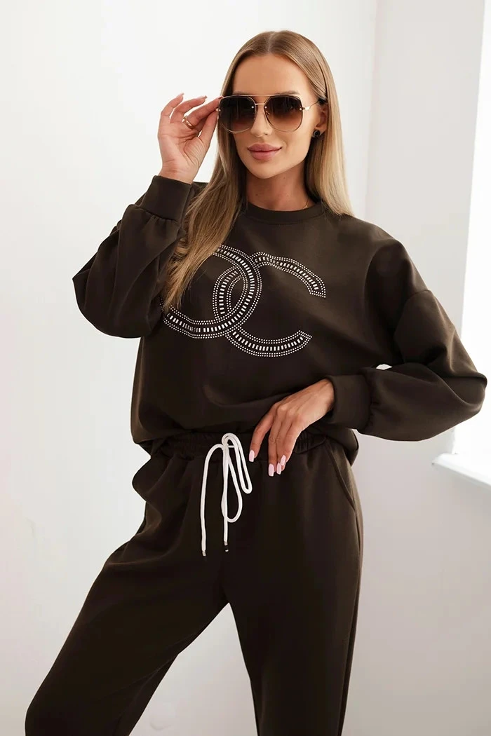 Stylový dámský komplet, který spojuje pohodlí s módním designem. Mikina s efektním, lesklým motivem na přední straně přitahuje pohledy a dodává celé stylizaci výjimečný charakter. Kalhoty s jednoduchým střihem a elastickým pasem a šňůrkou zajišťují pohodlí a volnost pohybu.