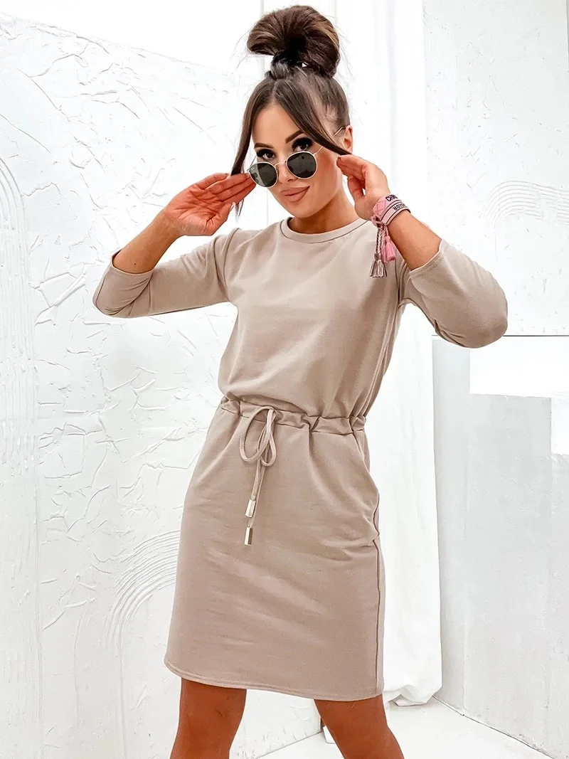 Šaty mají kulatý výstřih, 3/4 rukávy a dvě kapsy. V pase modelu je stahující šňůrka.