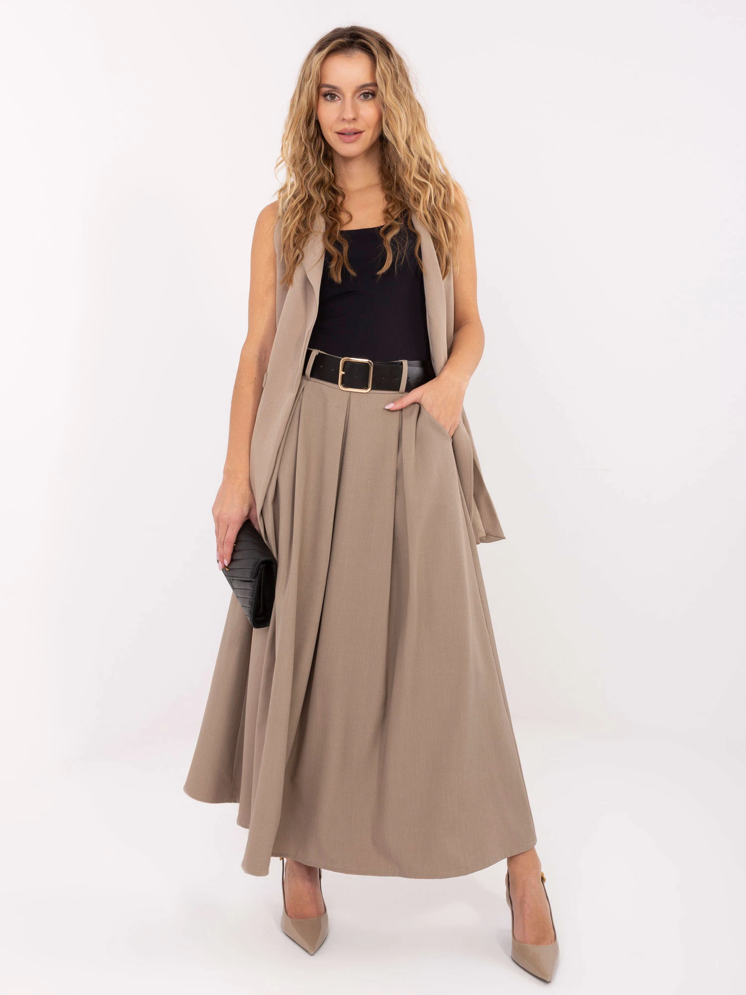 Dámská dlouhá rozevlátá sukně s páskem. V pase zadní část se všitou hrubou gumou.
