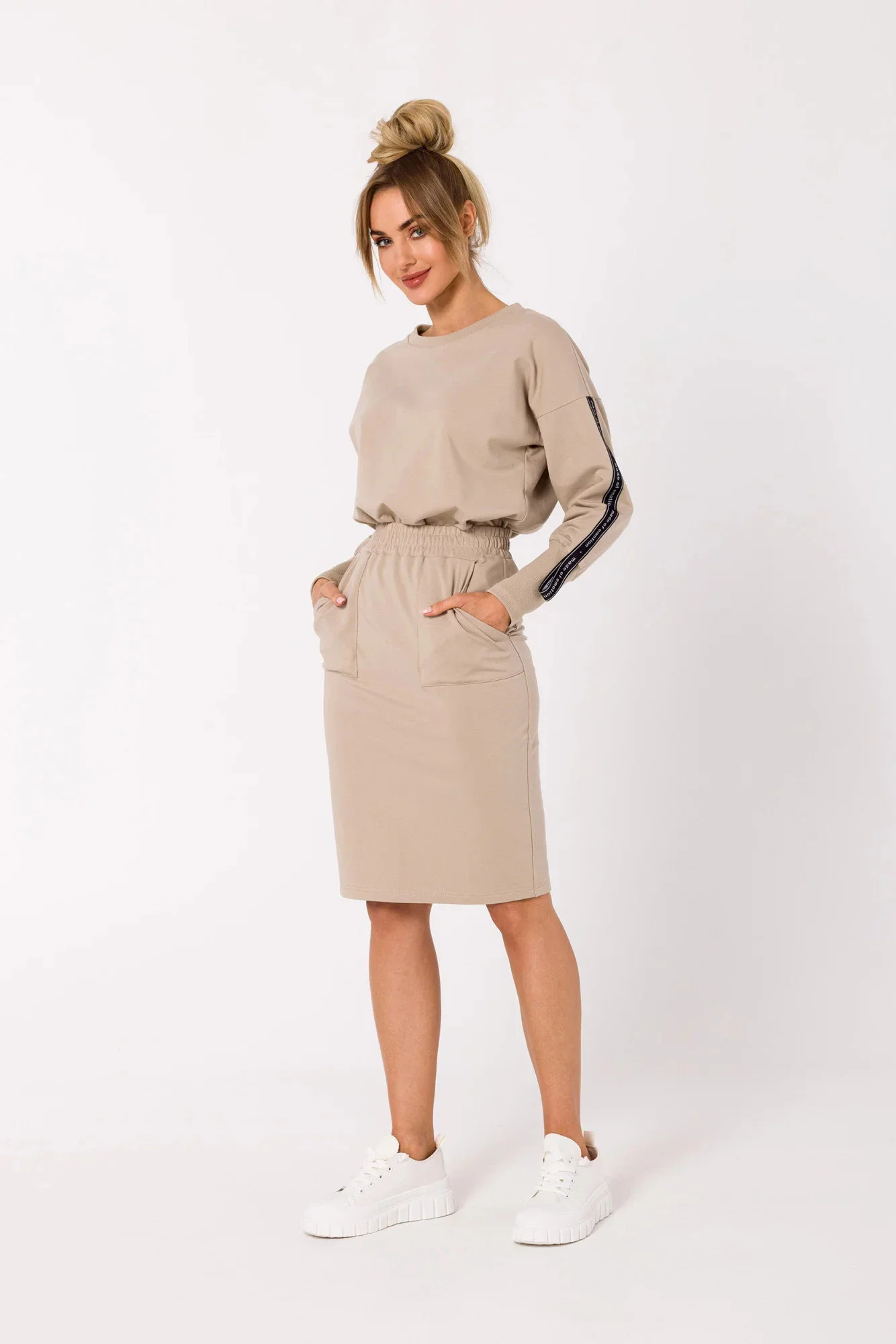 Pohodlná elastická tužková sukně s nabíraným elastickým pasem a velkými kapsami.