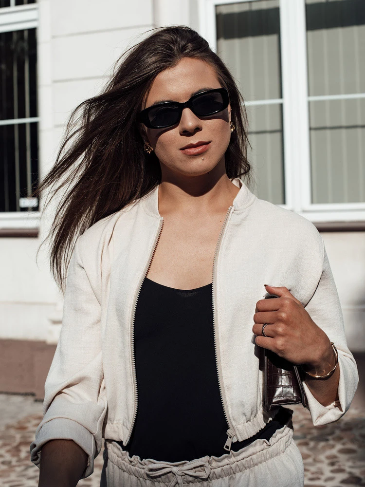 Tato nadčasová bunda typu bomber se stojáčkem, zapínáním na zip a žebrovanými manžetami a lemem je ideálním doplňkem k mnoha outfitům. Je vyrobena z vysoce kvalitní tkaniny a tvoří dokonalý komplet s kalhotami MADDIE.