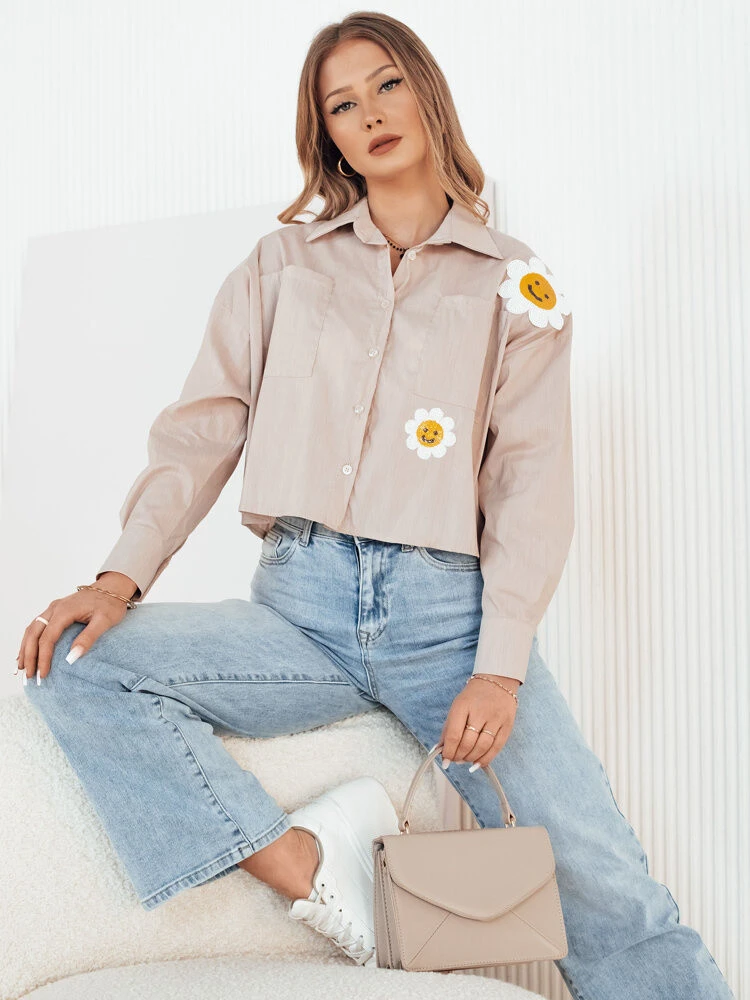 Tato košile s rozkošnými slunečními nášivkami je synonymem veselého stylu a ležérnosti. Krátký střih se skvěle kombinuje s kalhotami s vysokým pasem a díky volnému střihu se pohodlně nosí po celý den. Nezbytná součást šatníku každé ženy, která chce svému outfitu dodat nádech slunečních paprsků.