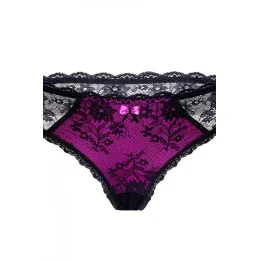 Dámská tanga Fifii ROZA - černá barva - vyrobená z krajky s květinovou výšivkou - ozdobná mašle ve fialové barvě