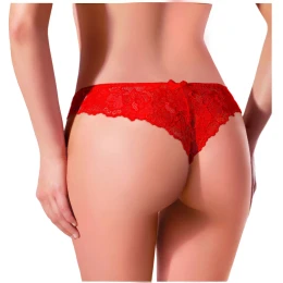 Dámské kalhotky string (tanga). Kalhotky jsou vyrobené z jemného tylu a ve přední části jsou ozdobené lesklými kamínky. Boky modelu a zadní díl jsou ušité z ažurové krajky s květinovým motivem.