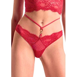 Okouzlující tanga v sytě červené barvě, které kombinují jemnou krajku s moderními detaily. Přední část zdobí smyslný průsvitný tyl s puntíkovým vzorem a rafinovaný pásek, který zvýrazní pas a dodá celému modelu odvážný nádech. Kovová ozdoba vpředu vytváří luxusní dojem a dělá z tohoto kousku skutečně výjimečné prádlo. Ideální pro speciální příležitosti i jako výrazný doplněk do vaší sbírky.