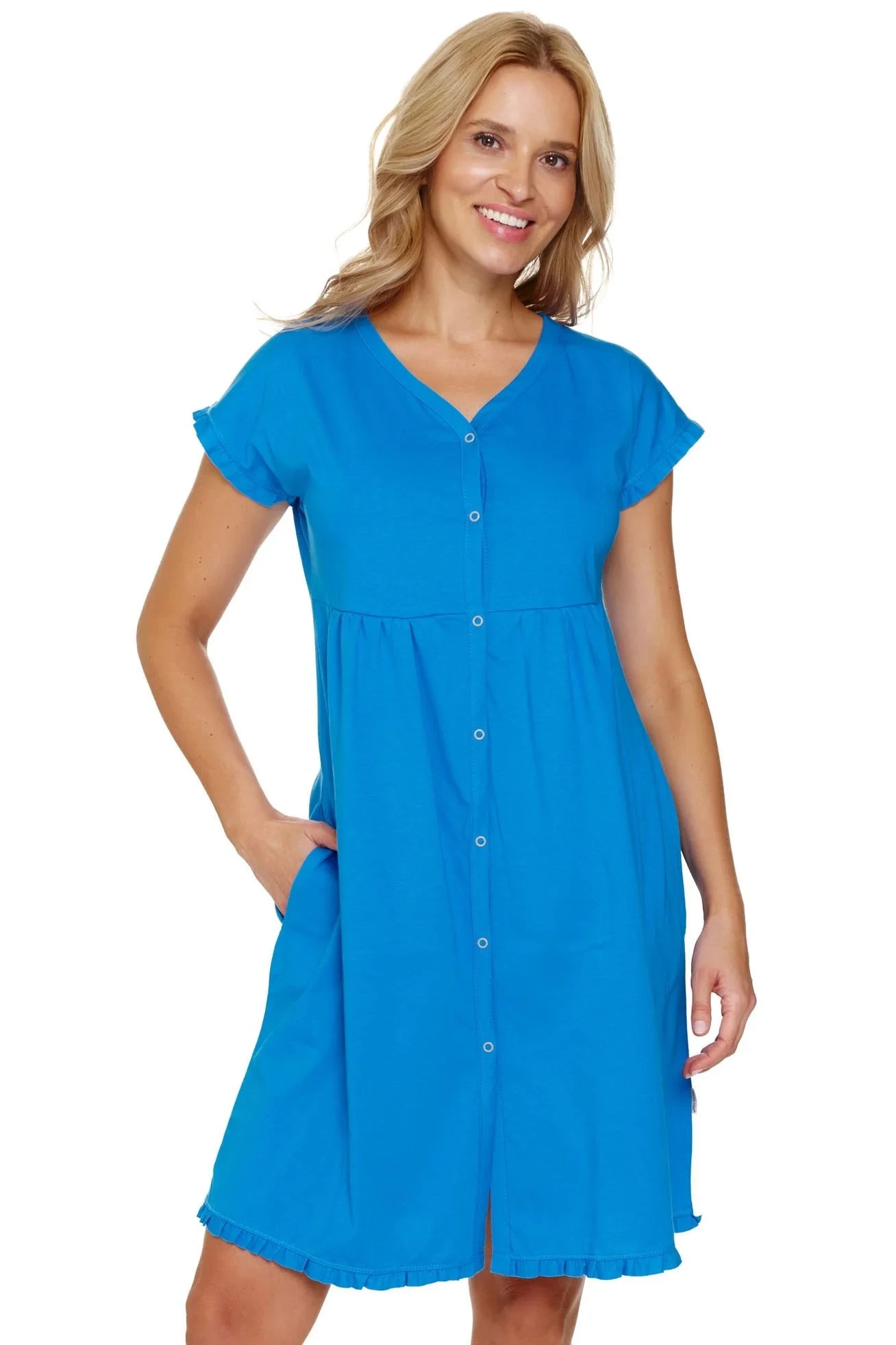 Dámská těhotenská košile 9600 blue Doctornap - světle modrá barva - z velmi kvalitní a příjemné organické bavlny - s krátkými rukávy - zakončené volánky - zapínání na knoflíky - ideální pro těhotné a kojící - na bocích kapsy - certifikát OEKO-TEX Standard 100