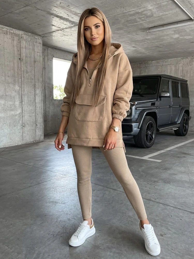 Souprava je ideální pro každodenní vycházky, procházky a neformální outfity. Mikina s kapucí doplňuje sportovní charakter soupravy a legíny vytvářejí konzistentní, pohodlný základ pro styling. Jednotlivé prvky soupravy lze kombinovat s dalšími oděvy a vytvářet tak různé soupravy pro různé denní doby.