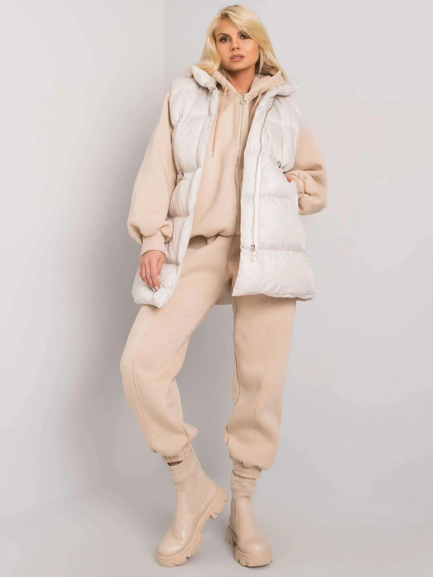 Sada obsahuje: rozepínací mikinu s kapucí, tepláky, péřovou vestu.