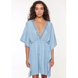 Dámská tunika značky LingaDore. Tunika je vhodná na pláž nebo k bazénu, perfektně ladí k plavkám. Tunika je vzdušná s volnými rukávy a "proužkovým vzorem". V pase je do lehké pružné gumičky a tím vytváří hezký tvar postavy. Po celé délce výstřihu jsou našité různé vzory z malých korálků. Tunika je dlouhá nad kolena.