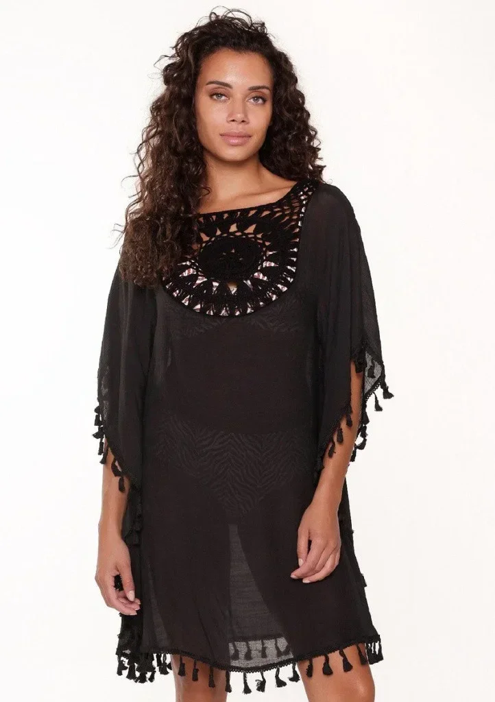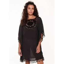 Dámská plážová tunika LingaDore. Tunika je z lehkého viskózového materiálu a je vhodná do horkých letních dnů jako přehoz na plavky. Je poloprůsvitná, v délce po kolena. Tunika má kulatý výstřih navazující na háčkovaný ornament. Po stranách jsou průstřihy na ruce, které vytvoří volné rukávy. Po celém obvodu je tunika lemovaná prošíváním s malými třásněmi.