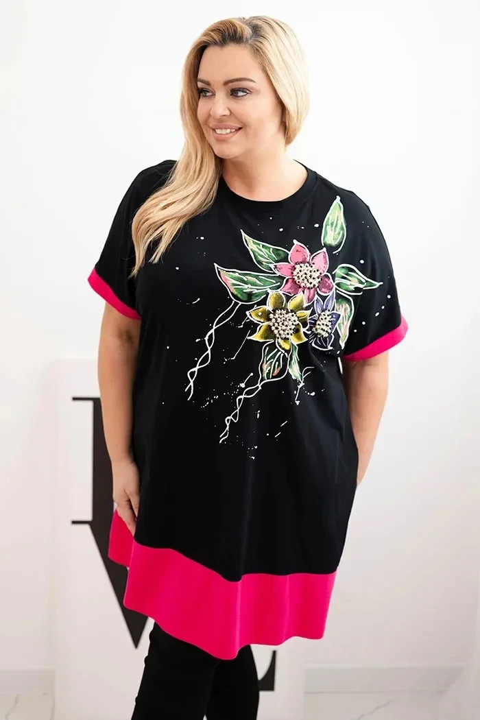 Dámská tunika Plus Size s květinovým vzorem a ozdobnými perličkami fuchsiová