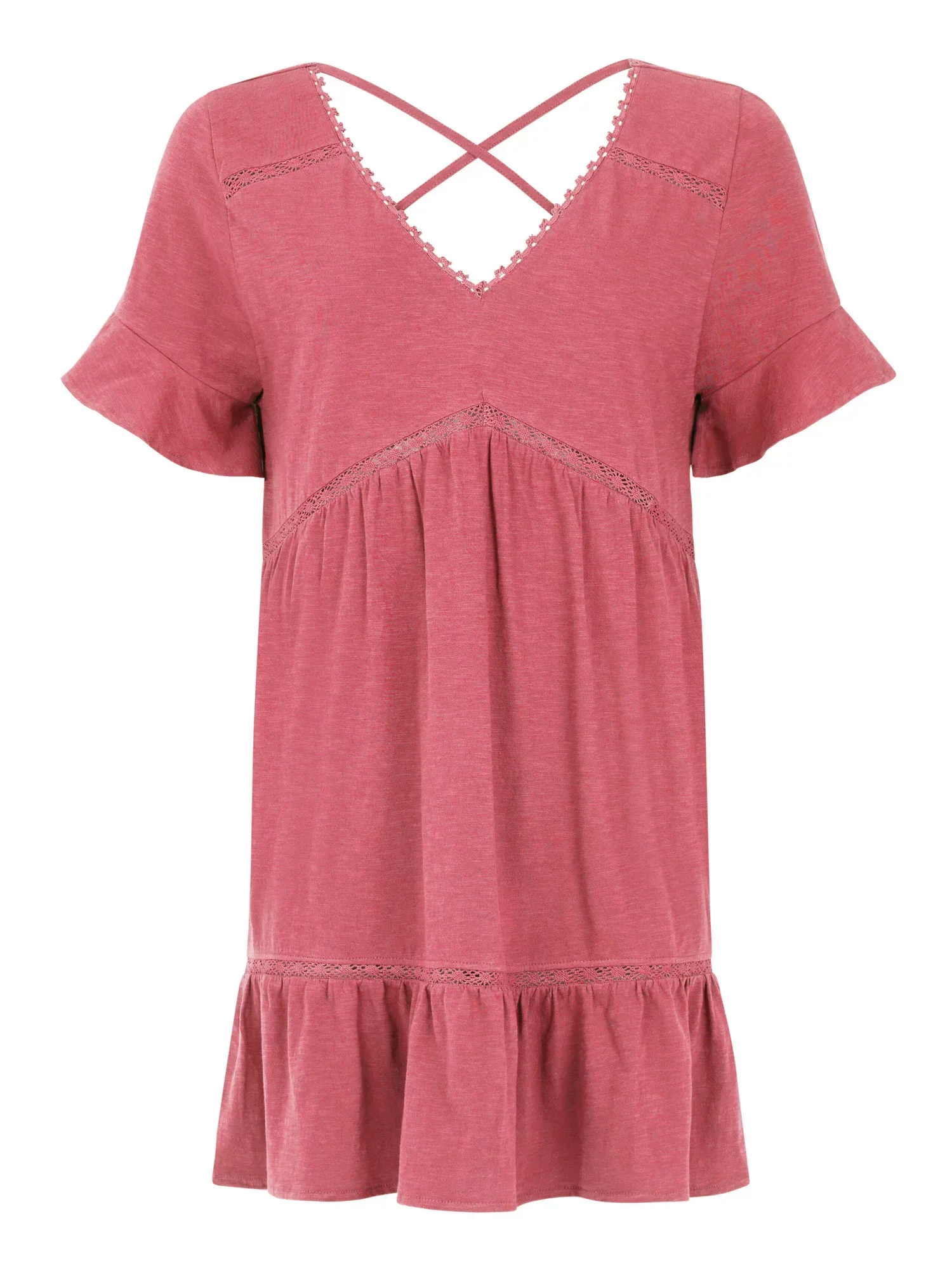 Překřížená ramínka vzadu dodávají klasickému designu tuniky stylový šmrnc.