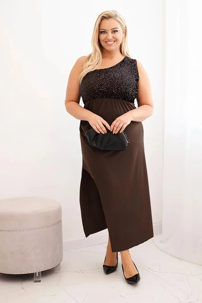 Dámská večerní šaty Plus Size na jedno rameno hnědá