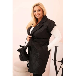 Stylová, prošívaná dámská vesta s páskem je nabídkou pro ženy, které si cení eleganci spojenou s pohodlím. Model s klasickým límcem a dekorativní broží „D” krásně zvýrazňuje siluetu díky přiloženému pásku, který lze regulovat v pase. Prošívaný materiál s geometrickým vzorem dodává celku moderní charakter a délka po kolena zajišťuje ochranu a komfort v chladnějších dnech.