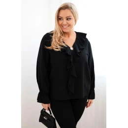 Dámská viskózová blůza Plus Size s volánem a ozdobnou broží černá