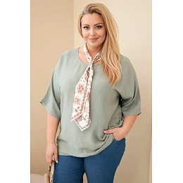 Dámská viskózová halenka Plus Size s krátkým rukávem a ozdobným šátkem khaki