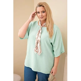 Dámská viskózová halenka Plus Size s krátkým rukávem a ozdobným šátkem tmavě mentolová