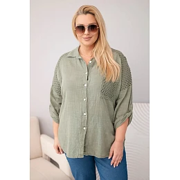 Dámská bavlněná košile ve velikosti Plus Size s límečkem a krajkovou vsadkou khaki