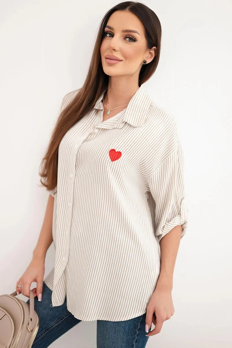 Tato dámská košile je ideální kombinací klasiky a dívčího kouzla! Vyrobena z vysoce kvalitní bavlny s přídavkem elastanu, zajišťuje nejen pohodlí při nošení, ale také krásné padnutí na postavě. Subtilní pruhovaný vzor a vyšívané červené srdíčko na prsou jí dodávají originalitu a lehkost.