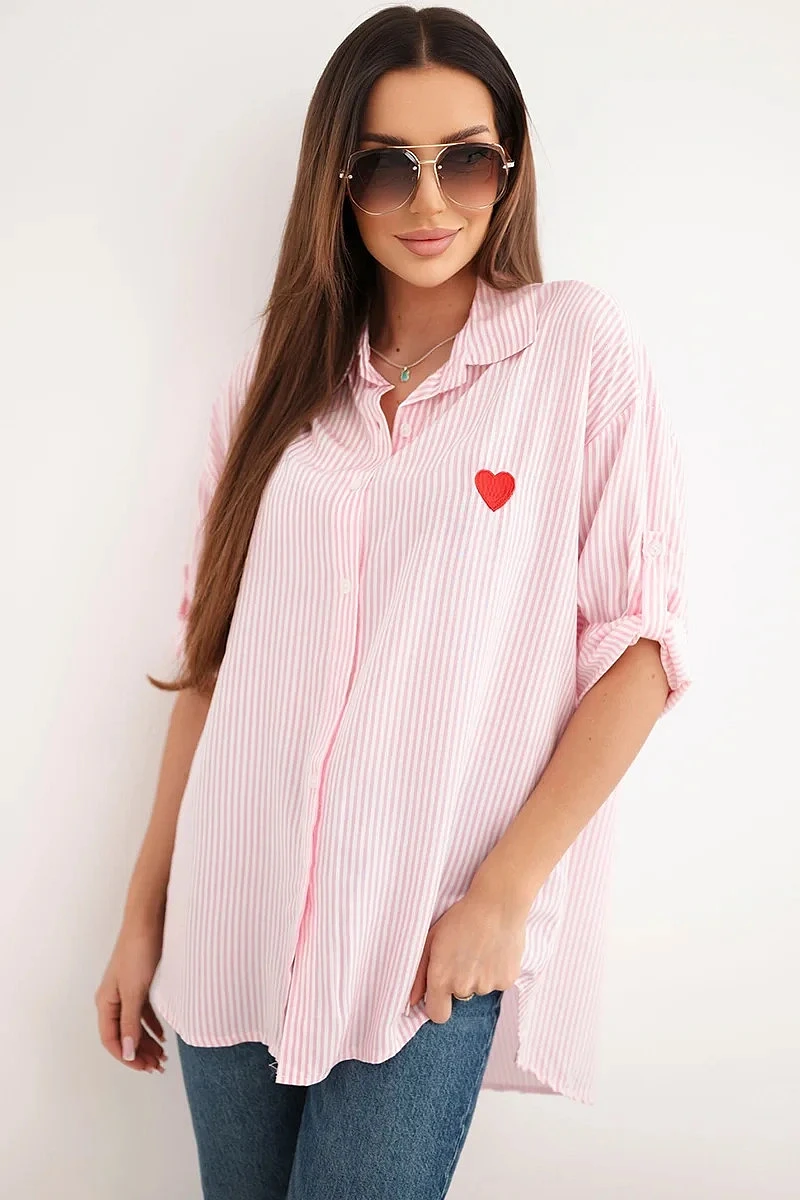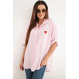 Tato dámská košile je ideální kombinací klasiky a dívčího kouzla! Vyrobena z vysoce kvalitní bavlny s přídavkem elastanu, zajišťuje nejen pohodlí při nošení, ale také krásné padnutí na postavě. Subtilní pruhovaný vzor a vyšívané červené srdíčko na prsou jí dodávají originalitu a lehkost.