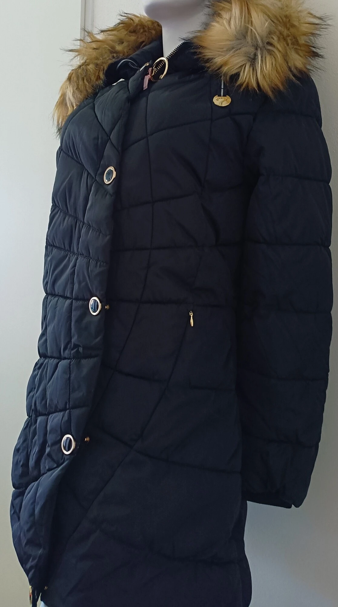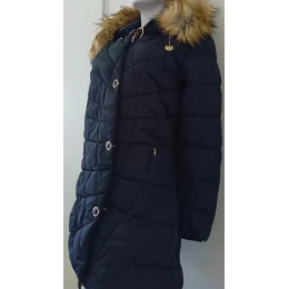 Dámský zimní dlouhý kabát, prošívaný, s kapucí a odepínací kožešinou.