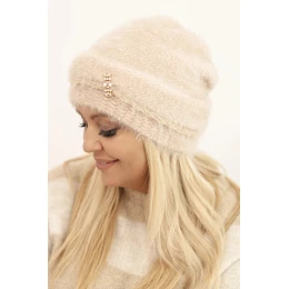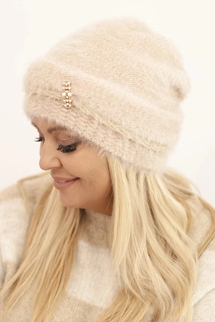 Dámská zimní čepice huňatá s perlami a ozdobným vzorem béžová
