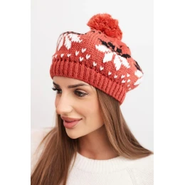 Dámská zimní čepice z vlny s motivem sněhových vloček a pomponem K457 ruda