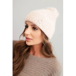 Čepice je ozdobena elegantním zlatým knoflíkem vpředu, který jí dodává jedinečný charakter. Jemná pastelová barva se skvěle hodí do ženských zimních stylizací.
