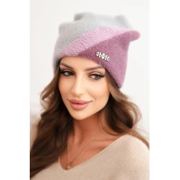 Dámská zimní čepice z huňaté pleteniny s ozdobnou aplikací šedá + tmavě fialová