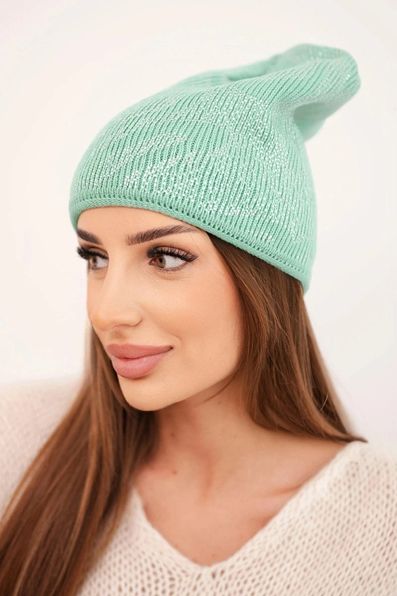 Stylová dámská čepice s jemným leskem, vyrobená z vysoce kvalitní pleteniny s přídavkem mohairu a vlny. Zlatý, rostlinný vzor přitahuje pozornost a dodává eleganci, díky čemuž je čepice ideální jak na každodenní nošení, tak jako módní akcent k zimním stylizacím.