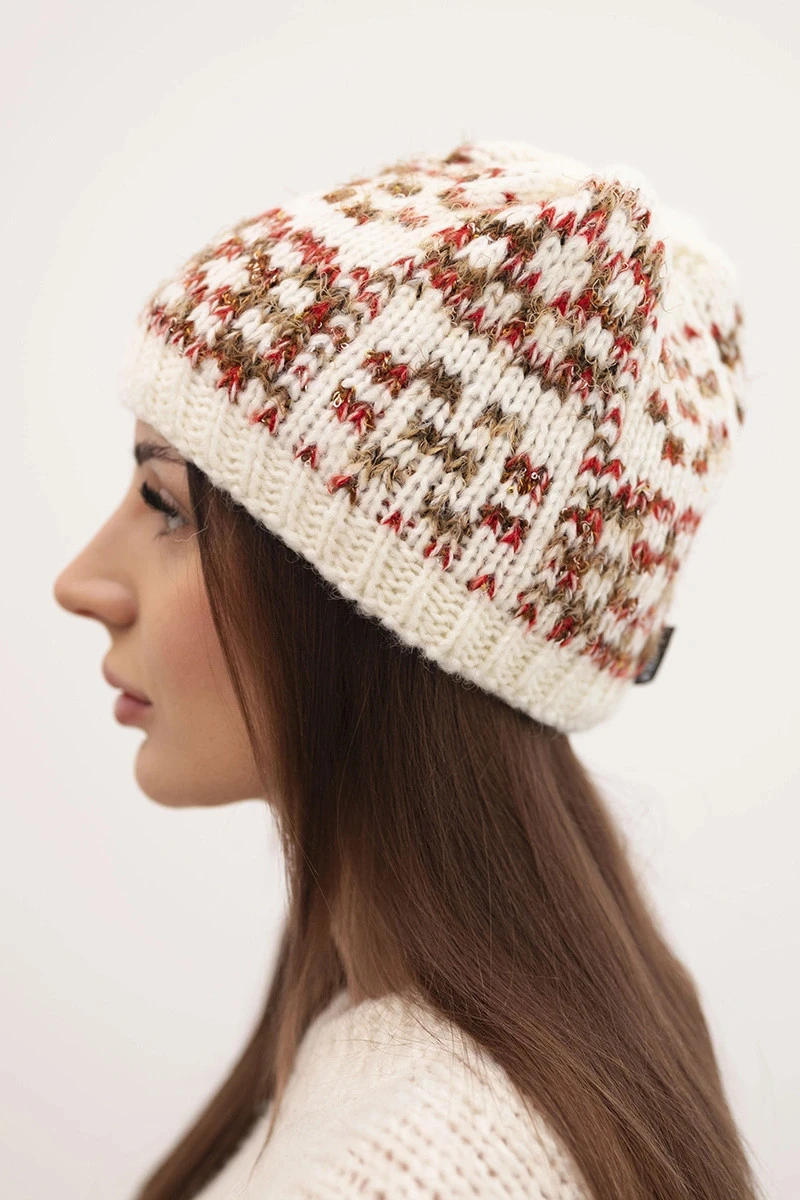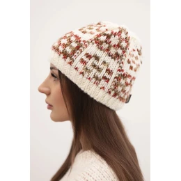 Dámská zimní čepice s barevnou přízí a silným lemem K355 ecru+cervená+camelová