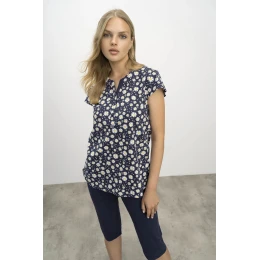 Dámské dvoudílné pyžamo, vrchní díl tmavě modrý s potiskem sedmikrásek, s krátkým rukávem, spodní díl jednobarevný 3/4 délka.