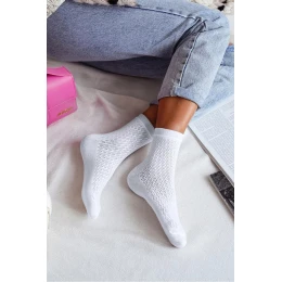 Bílé dámské azurové ponožky jsou měkké, pohodlné a ideální pro každodenní nošení. Lehký a prodyšný vzor dodává ponožkám elegantní vzhled a příjemný pocit na noze. Jednobarevný design je nadčasový a snadno kombinovatelný s různou obuví a outfity.